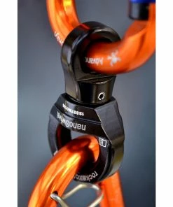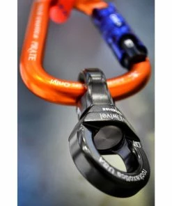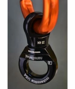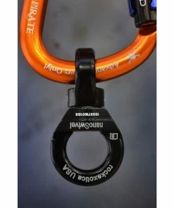 The Nano by Rock Exotica is the lightest load-rated swivel available. It features an integrated rubber o-ring that holds it snugly in place on most carabiners.